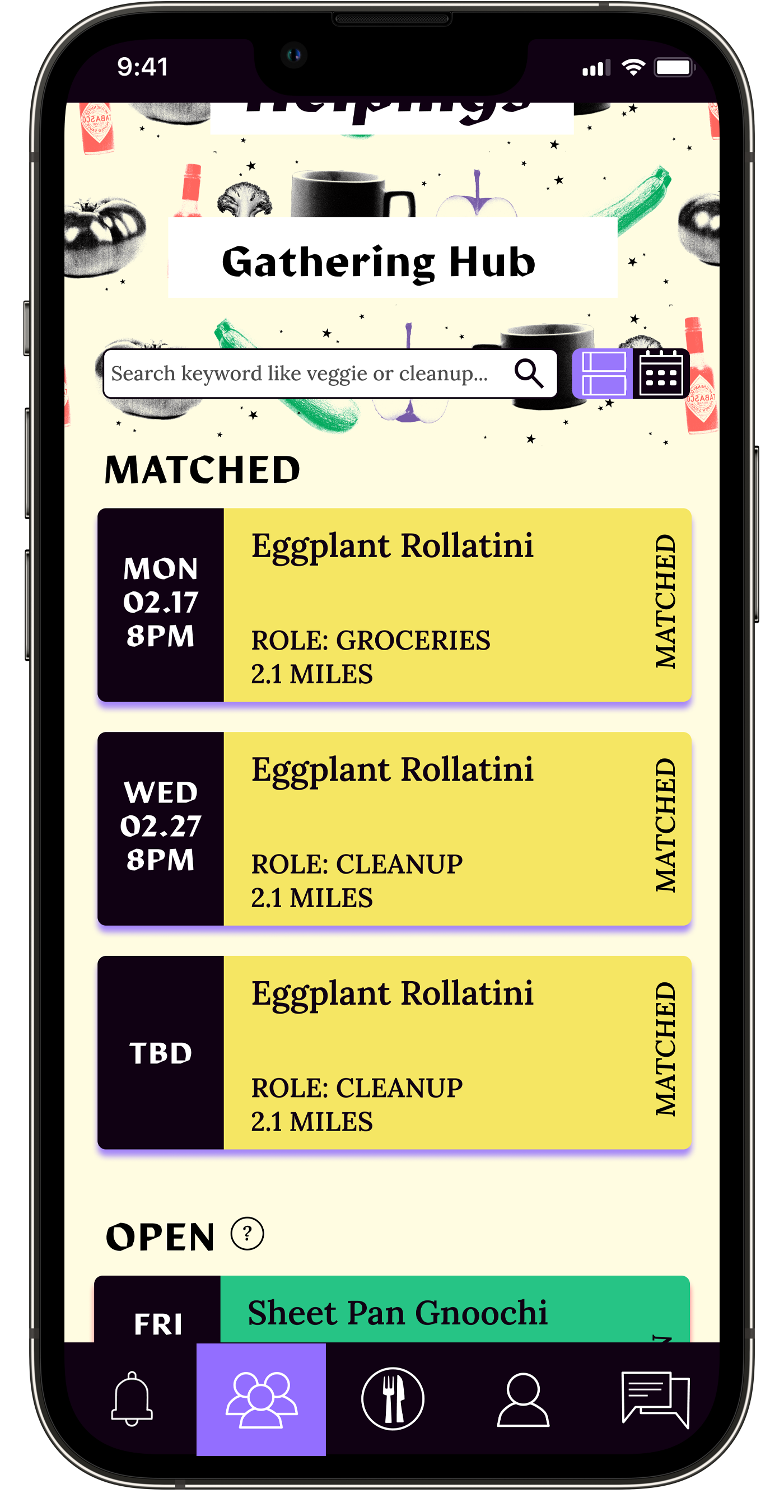 in profile.Get connected to others and assigned a role within a gathering that is based on profile and meal specifications